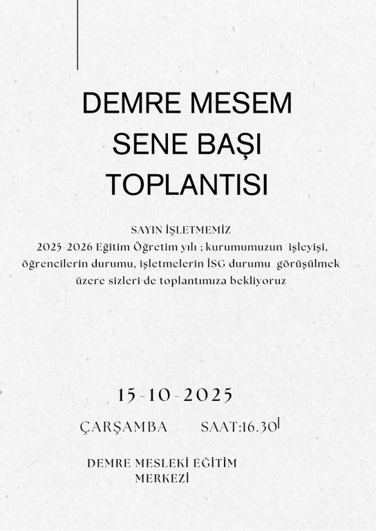 15/10/2025 TARİHİNDE SAAT 16.00 DA İŞLETME SENE BAŞI TOPLANTISI YAPILACAKTIR. TÜM İŞLETMELERİMİZİN KATILMASI RİCA OLUNUR.